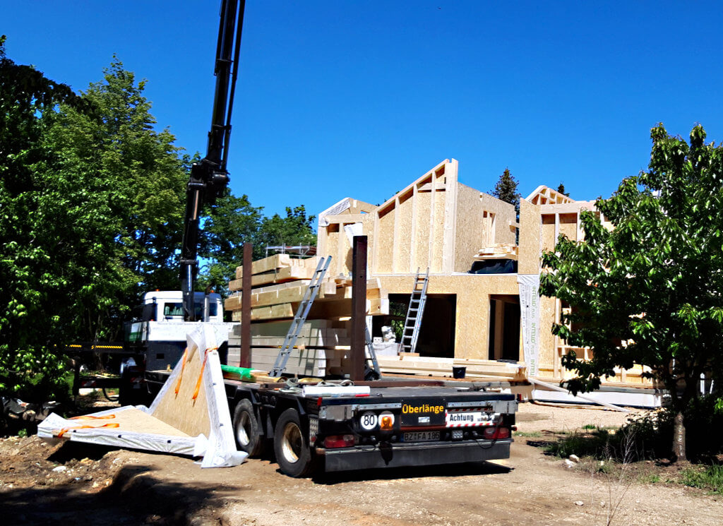 Für den Transport und die Montage der vorgefertigten Elemente stehen unsere Spezial-LKW mit Ladekran zur Verfügung.